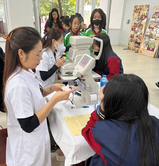 Kỹ thuật viên Bệnh viện Hitec kiểm tra kính và đo khúc xạ tự động cho học sinh trong buổi sàng lọc tại trường THCS Thực nghiệm (Hà Nội)