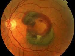 - Thoái hóa hoàng điểm thể ướt hay tân mạch: Tại hoàng điểm có nhiều mạch máu bất thường phát triển làm phá vỡ cấu trúc bình thường của hoàng điểm, gây bong biểu mô sắc tố, xuất huyết võng mạc rồi gây ra một cấu trúc sẹo xơ mạch vùng hoàng điểm gây tổn thị lực nghiêm trọng.