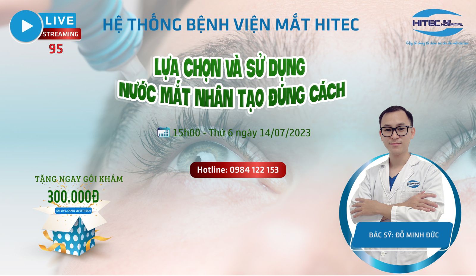 Đón xem livestream số 95 tuần này lúc 15h00 ngày 14/07/2023 trên fanpage của Bệnh viện Mắt Kỹ Thuật Cao Hà Nội để được cung cấp thông tin chi tiết về sản phẩm nước mắt nhân tạo với sự hỗ trợ chuyên môn từ bác sĩ nhãn khoa Đỗ Minh Đức - Khoa Khúc Xạ - Bệnh viện Mắt Kỹ Thuật Cao Hà Nội.