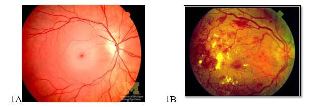 Hình 1: Hình ảnh đáy mắt (A. Bình thường; B. Bệnh võng mạc đái tháo đường)