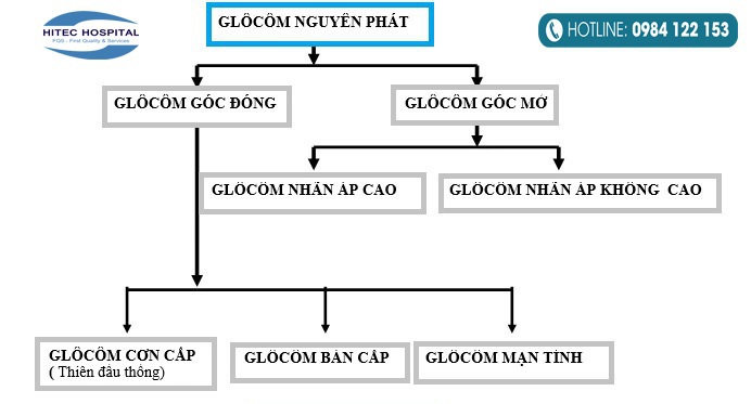 – Glôcôm góc mở nguyên phát. Glôcôm góc mở nguyên phát là một hội chứng gồm tổn thương đầu thị thần kinh liên quan tới góc tiền phòng mở và nhãn áp tăng hoặc đôi lúc ở mức trung bình. Bệnh xảy ra do bị tắc nghẽn không hoàn toàn ở góc thoát thuỷ dịch của mắt khiến tăng áp suất mắt. Điều này lâu ngày sẽ khiến các dây thần kinh thị giác bị tổn thương. Quá trình này diễn ra từ từ và không gây đau đớn. khiến bệnh nhân khó nhận biết được triệu chứng bệnh. Phân loại glôcôm theo nguyên nhân gây ra như sau: