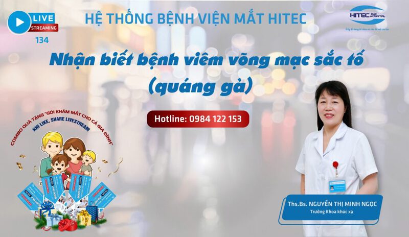 Lưu ý: Bệnh phát triển không giống nhau ở mỗi người, biểu hiện bệnh cũng tùy từng giai đoạn bệnh Bệnh nhân điều trị viêm võng mạc sắc tố cần đi khám định kỳ và ngay khi có những dấu hiệu bất thường để phát hiện các bệnh lý có thể kèm theo như: tật khúc xạ, đục thể thủy tinh, glôcôm, bong võng mạc… Việc đi khám định kỳ và khám khi có bất thường sẽ giúp điều trị kịp thời, bảo tồn thị lực tối ưu. Đón xem livestream số 134 lúc 15h00 ngày 19/04/2024 trên fanpage của Hệ thống Bệnh viện Mắt Hitec để biết thêm thông tin chi tiết về bệnh viêm võng mạc sắc tố Khách mời: Ths.Bs Nguyễn Thị Minh Ngoc – Trưởng khoa khúc xạ Bệnh viện Mắt Kỹ Thuật Cao Hà Nội. Đặc biệt, Combo quà tặng: 4 voucher ???́? ??̆́? ???̂̃? ???́ dành cho quý khán giả tương tác (like/share/comment) dưới post livestream của chương trình vào chiều thứ 6 hàng tuần. Để được tư vấn các bệnh lý về mắt, xin vui lòng liên hệ hotline ????.???.??? để được hỗ trợ -✺ ✺ ✺ - Hotline: ???? ??? ??? Website: https://benhvienmat.vn Youtube: https://www.youtube.com/@hethongbenhvienmathitec/videos ?Ệ ??Ố?? ?Ệ?? ??Ệ? ?Ắ? ????? - ????? ??? ???????? Cơ sở 1: Bệnh viện mắt kỹ thuật cao Hà Nội: 51-53-55 Trần Nhân Tông, Nguyễn Du, Hai Bà Trưng, Hà Nội Cơ sở 2: Bệnh viện chuyên khoa mắt HITEC: 55 Hàm Long, Hàng Bài, Hoàn Kiếm, Hà Nội Cơ sở 3: Trung tâm mắt kỹ thuật cao Sài Gòn: 28 Đống Đa, Phường 2, Q. Tân Bình, HCM ????? - ??̣̂? ??̂? ??? đ?̂? ??̆́? ??́??