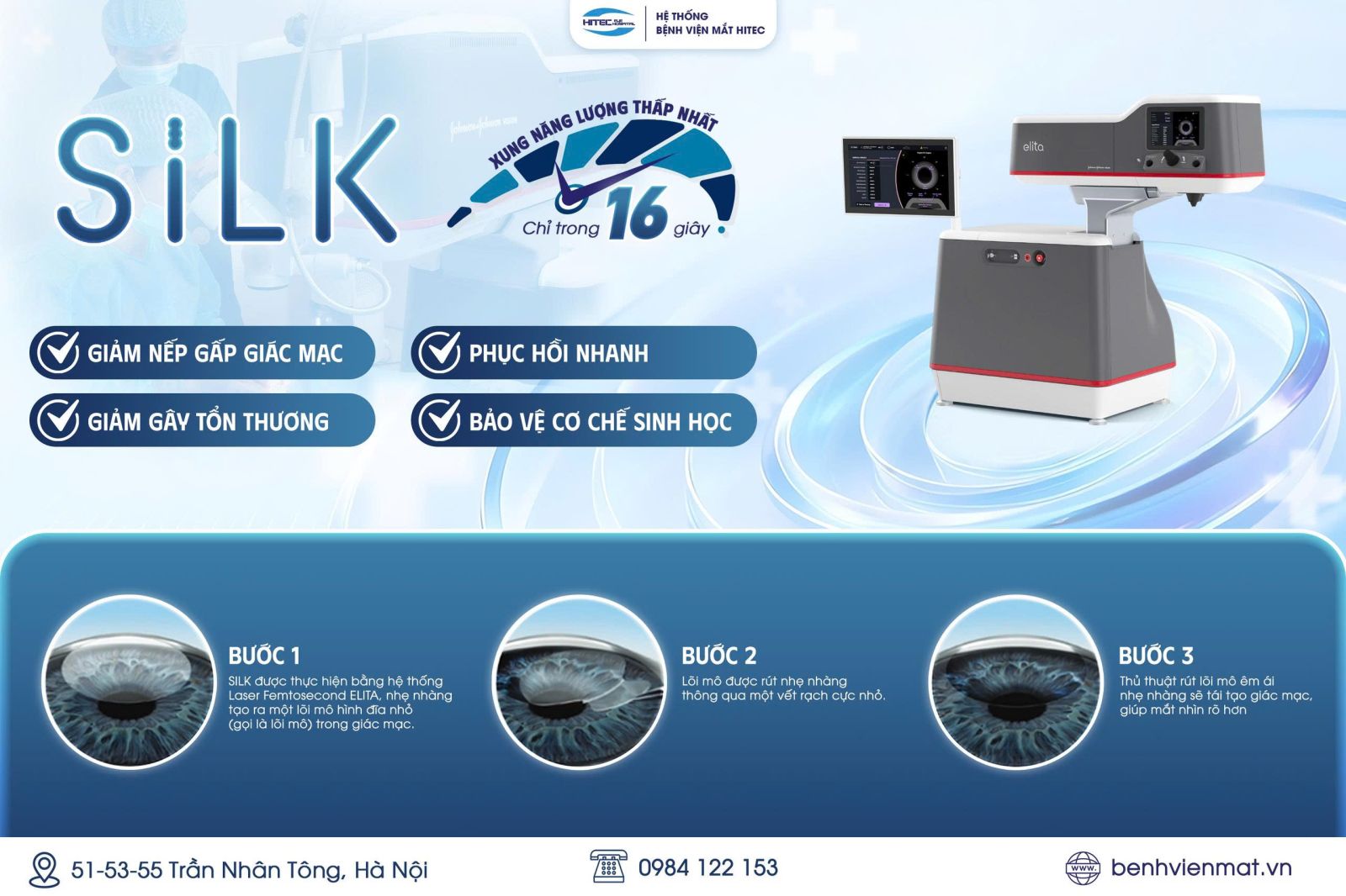 Một trong những điểm nổi bật của công nghệ SILK là sử dụng mức năng lượng laser thấp hơn so với nhiều phương pháp phẫu thuật khúc xạ hiện nay, kết hợp với tần số laser nhanh. Nhờ đó mang lại nhiều lợi ích cho người bệnh như: thời gian tác động laser được rút ngắn còn khoảng 16 giây/mắt, giúp quá trình phẫu thuật diễn ra nhẹ nhàng và nhanh chóng; giảm mức độ xâm lấn giác mạc; khả năng phục hồi thị lực sớm trong vòng 24 giờ và chất lượng thị giác rõ nét, ổn định sau điều trị.