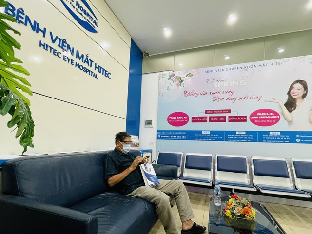 Đến gần bác L.X.H, 71 tuổi (đến từ Thanh Hóa) đang lướt web bằng smartphone tại sảnh chờ của Bệnh viện Mắt Hitec, cơ sở 55 Hàm Long, Hàng Bài, Hoàn Kiếm, Hà Nội., tôi tò mò hỏi: "Bác đến chờ khám mắt ạ?". Bác dừng tay, ngẩng đầu nhìn tôi và nói: "tôi đến mổ mắt xong rồi, đang chờ con đến đón!"