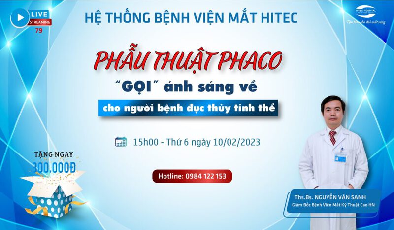 Đón xem livestream 79 lúc 15h00 ngày 10/02/2023 trên fanpage của Bệnh viện Mắt Kỹ Thuật Cao Hà Nội cung cấp đầy đủ thông tin về bệnh lý đục thủy tinh thể từ chuyên gia nhãn khoa Ths.Bs Nguyễn Văn Sanh - Giám đốc Bệnh viện Mắt Kỹ Thuật Cao Hà Nội.
