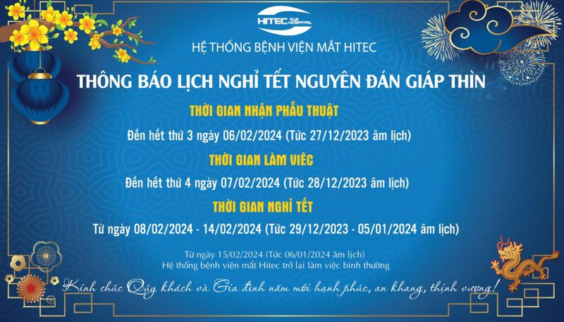 Từ ngày 15/02/2024 (Tức 06/01/2024 âm lịch) Hệ thống bệnh viện mắt Hitec trở lại làm việc bình thường .