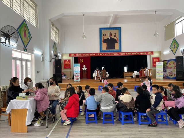 Học sinh được các chuyên gia đo khúc xạ, kiểm tra kính trong chương trình tầm soát tật khúc xạ do Bệnh viện HITEC tổ chức tại trường.