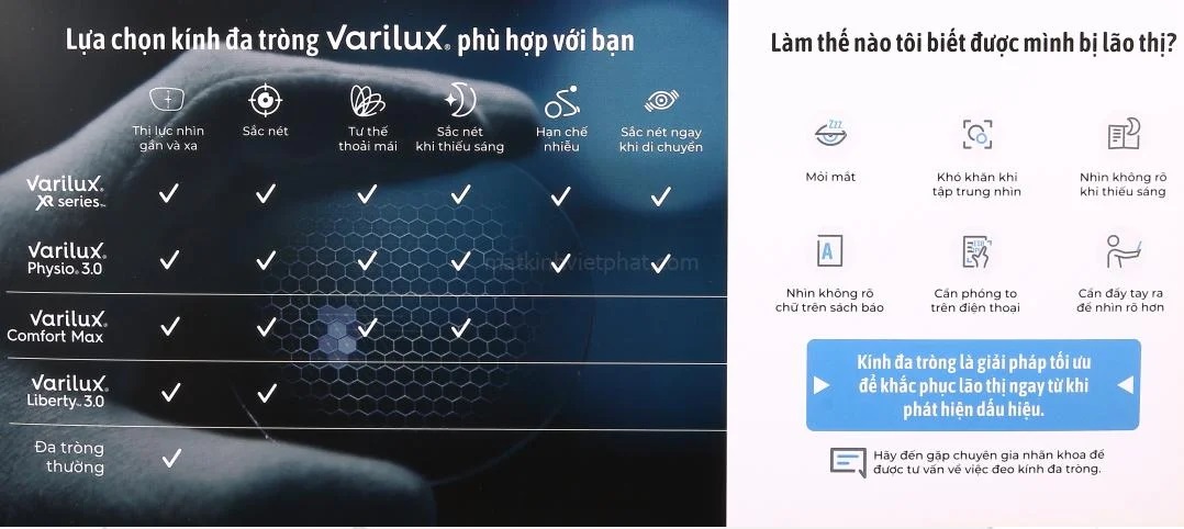 Đừng để điều này cản trở thói quen và các hoạt động thường hằng ngày của bạn, đã có giải pháp tiên tiến được tin dùng bởi hàng trăm triệu người trên toàn thế giới – Kính đa tròng Varilux® , trả lại thị lực rõ nét và tự nhiên trong mọi khoảng cách, xóa bỏ giới hạn của các loại kính khác.