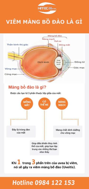Màng bồ đào có ba phần đó là mống mắt, thể mi và màng mạch. Đây là nơi chứa nhiều mạch máu, bao gồm các tĩnh mạch và động mạch đưa máu nuôi dưỡng mắt. Viêm màng bồ đào là tình trạng viêm sưng của một trong ba các bộ phận nêu trên. Viêm màng bồ đào là bệnh lý thường gặp ở mắt do nhiều nguyên nhân. Để hiểu rõ hơn về bệnh viêm màng bồ đào có chữa khỏi được không, cùng chuyên gia nhãn khoa Hitec tìm hiểu nguyên nhân và cách điều trị bệnh viêm màng bồ đào qua bài viết dưới đây: 1.Viêm màng bồ đào là bệnh gì? Màng bồ đào là lớp giữa của mắt, có nhiều mạch máu nuôi dưỡng mắt. Bao gồm mống mắt, thể mi, màng mạch. Viêm màng bồ đào xảy ra khi viêm 1 phần hoặc toàn bộ màng bồ đào. Viêm màng bồ đào có thể làm phá hủy những mô mắt quan trọng. Về sau, dẫn đến tình trạng mất thị lực vĩnh viễn. 2.Phân loại viêm màng bồ đào Dựa trên vị trí tổn thương của mắt, viêm màng bồ đào được chia thành 3 nhóm sau: